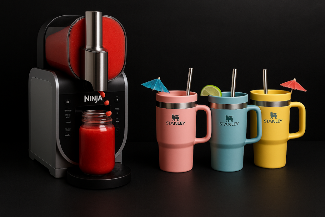 Create your own slushies, frozen cocktails, frappe, or milkshakes at home with the Ninja Slushy and take your drinks poolside or to the beach with the Stanley cups.