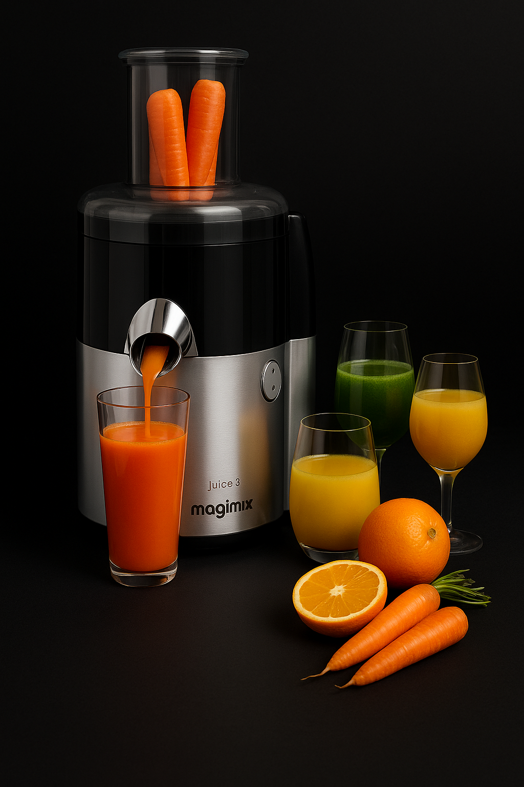 Includes : Magimix Juice Expert 5 (5-in-1) juice filter, citrus press, Extra Press, vegetable slicer, and spiral expert. (ingredients not included)